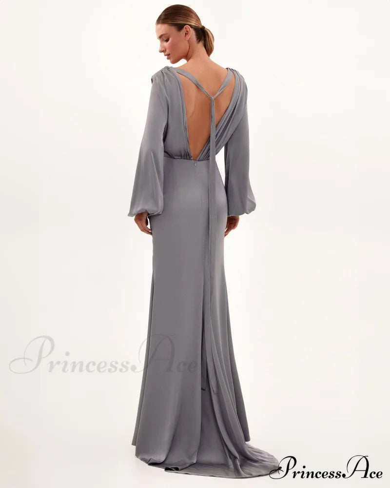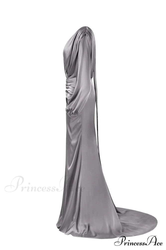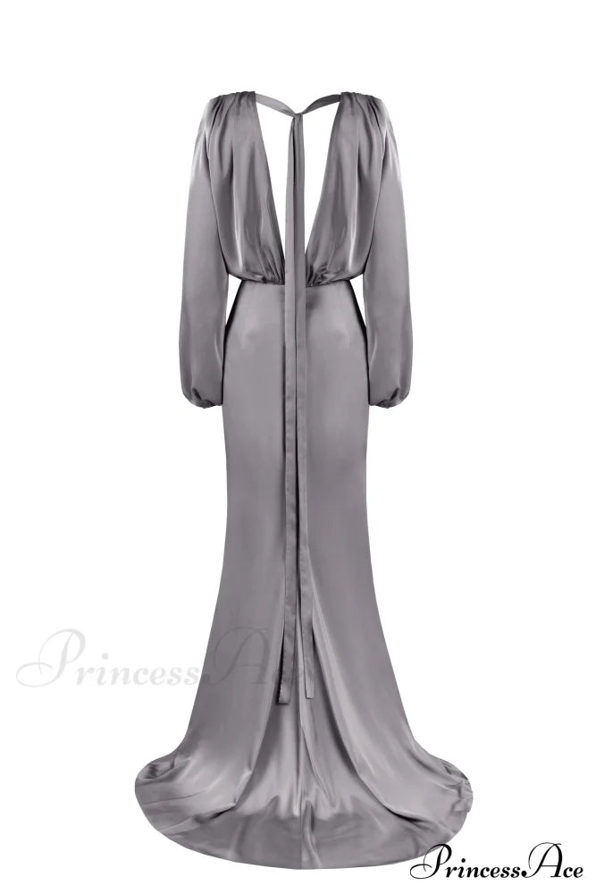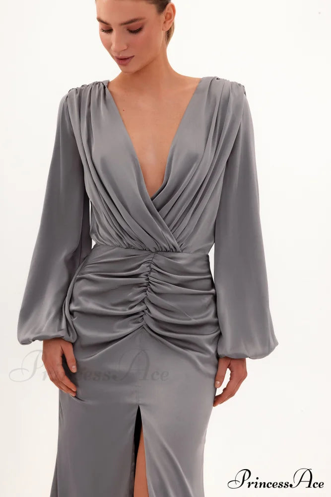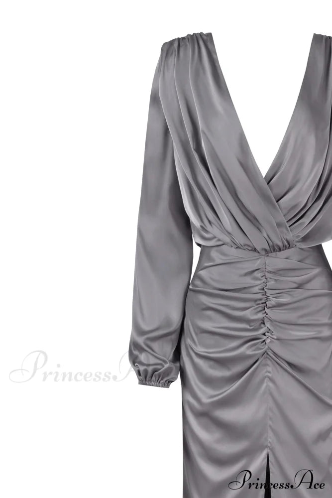 Dieses staubblaue Maxikleid ist perfekt für eine Hochzeit oder Partysaison. Es ist aus glänzender Seide gefertigt und hat eine bodenlange Silhouette. Es besticht durch einen gewickelten V-Ausschnitt und eine Drapierung, die sich an der Hüfte sammelt. Das Kleid hat Puffärmel, einen V-förmigen Rückenausschnitt mit zartem Schaldetail und einen Oberschenkelschlitz mit ausgestellter Schleppe.