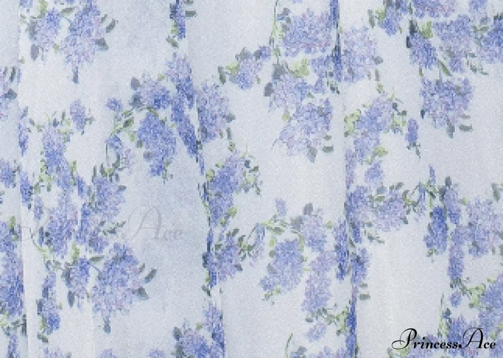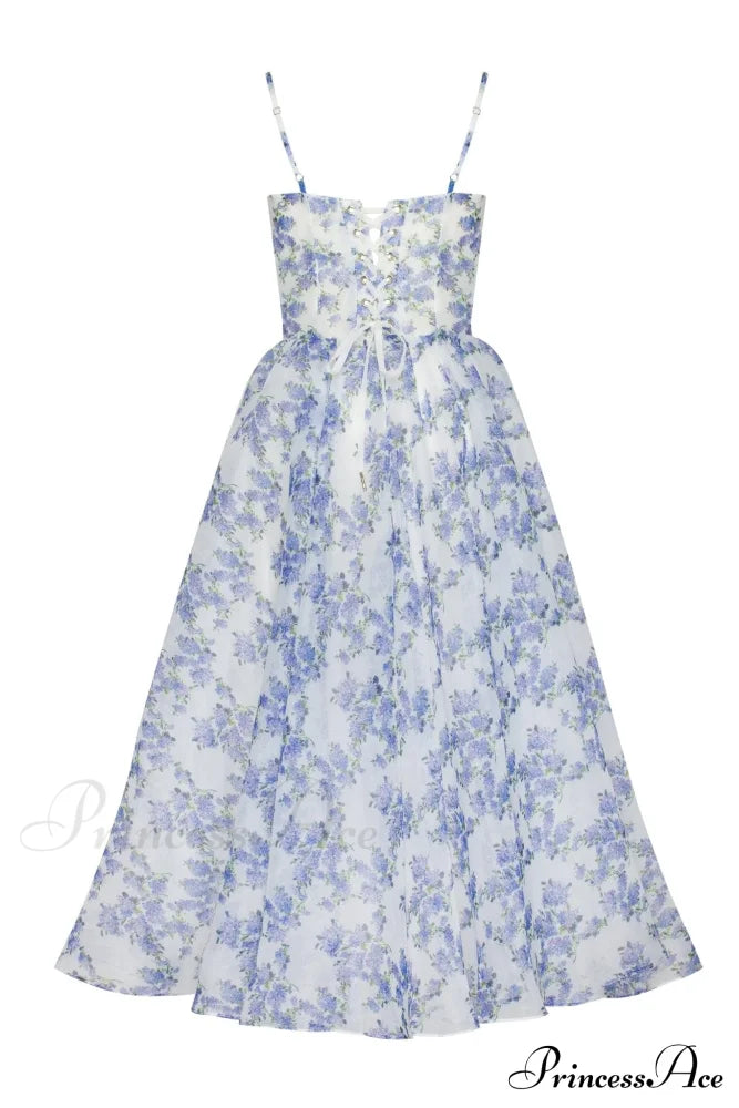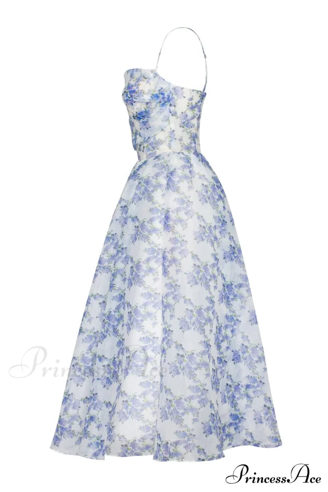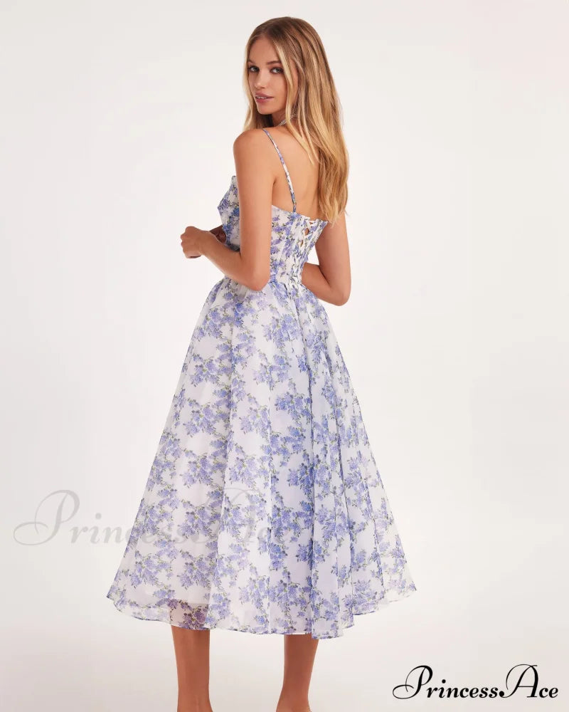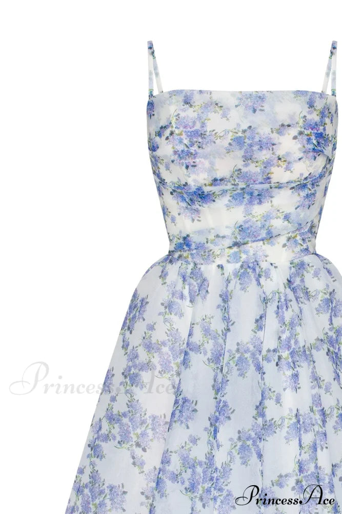 Zartes Spaghettiträgerkleid mit mittellangem Puffrock. Mit ausgestelltem Rock und einem figurbetonten, gerüschten Oberteil mit Spitze auf der Rückseite. Das Kleid ist mit einem pastellblauen Blumenmuster gestaltet.