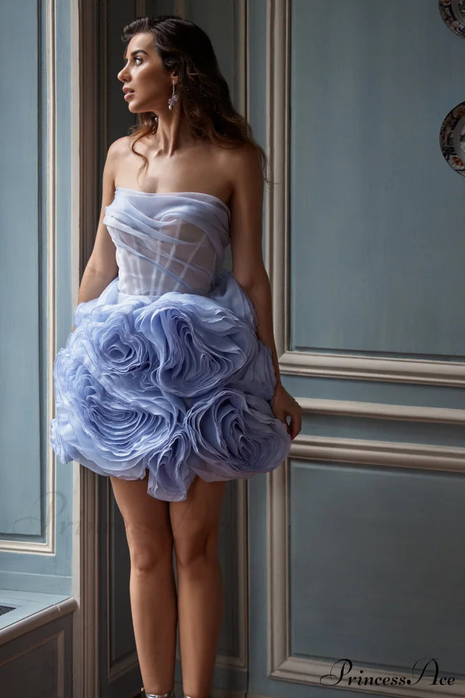 Lavendelfarbenes Minikleid aus glänzendem Organza mit übergroßen Organza-Rosen auf dem Rock. Das halbtransparente Oberteil ist am Ausschnitt mit Tüll verziert und hat einen Schnürverschluss.