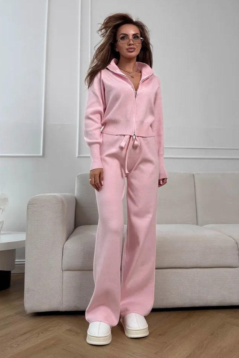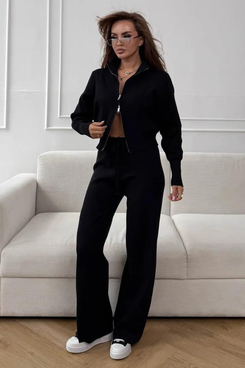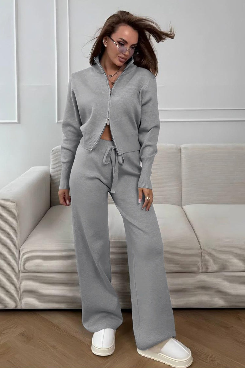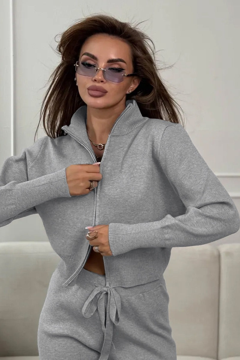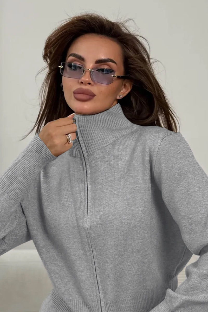 Zweiteiliges Set aus tailliertem Strick-Pendler-Outfit mit Zwei-Wege-Reißverschluss und taillierter Strickkonstruktion
