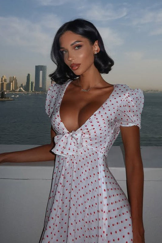 Sexy Minikleid mit tiefem V-Ausschnitt, Puffärmeln, hoher Taille und Polka-Dots