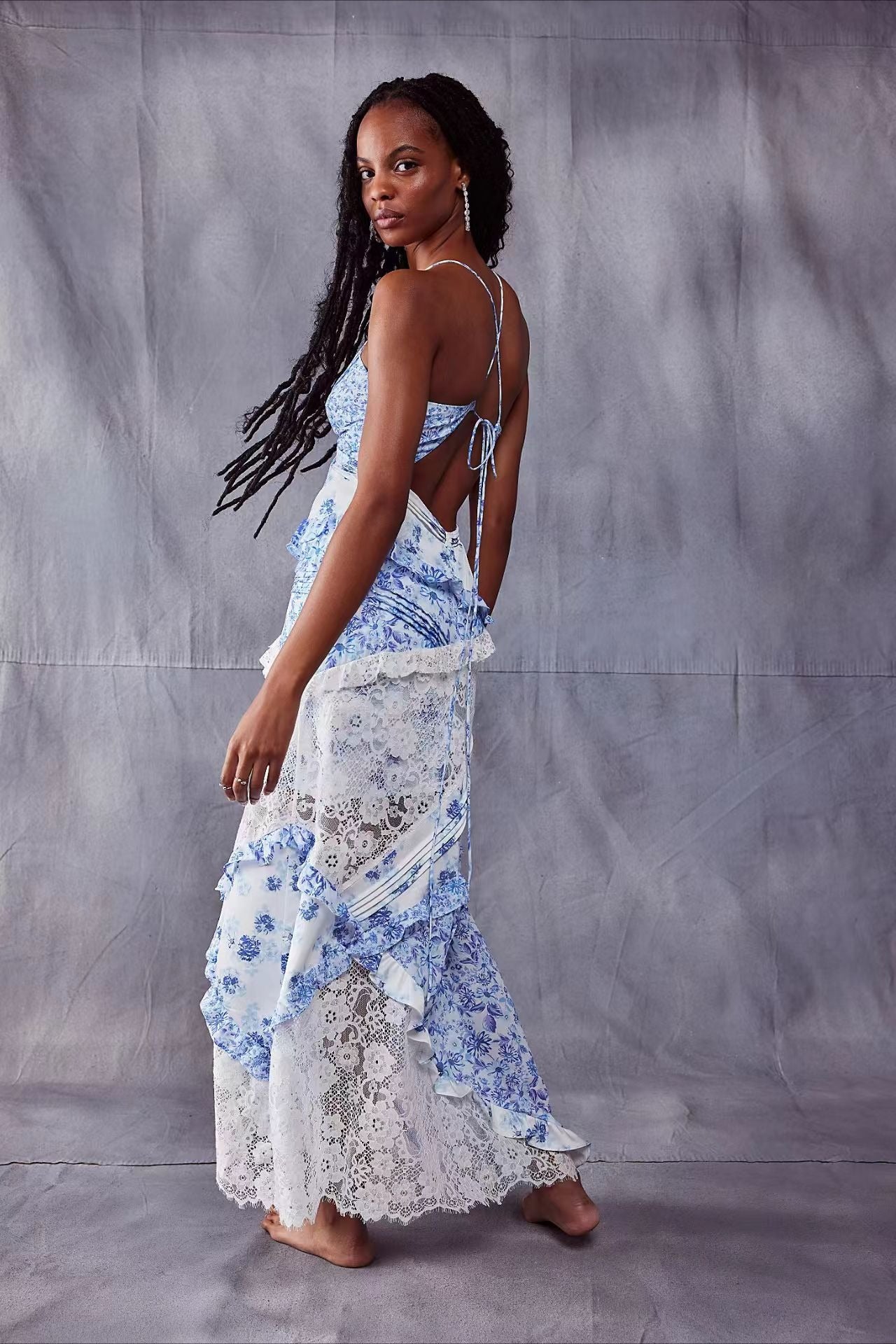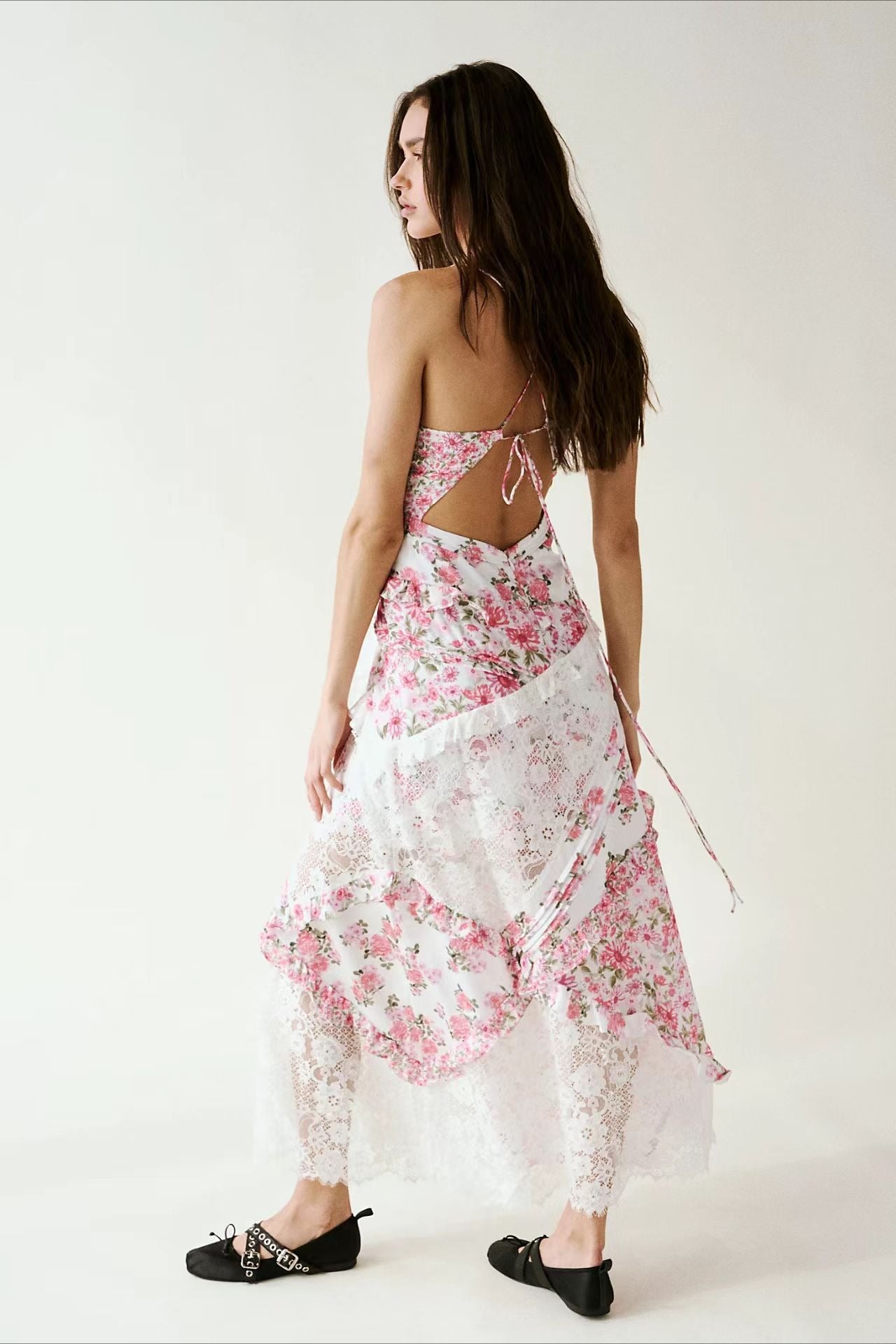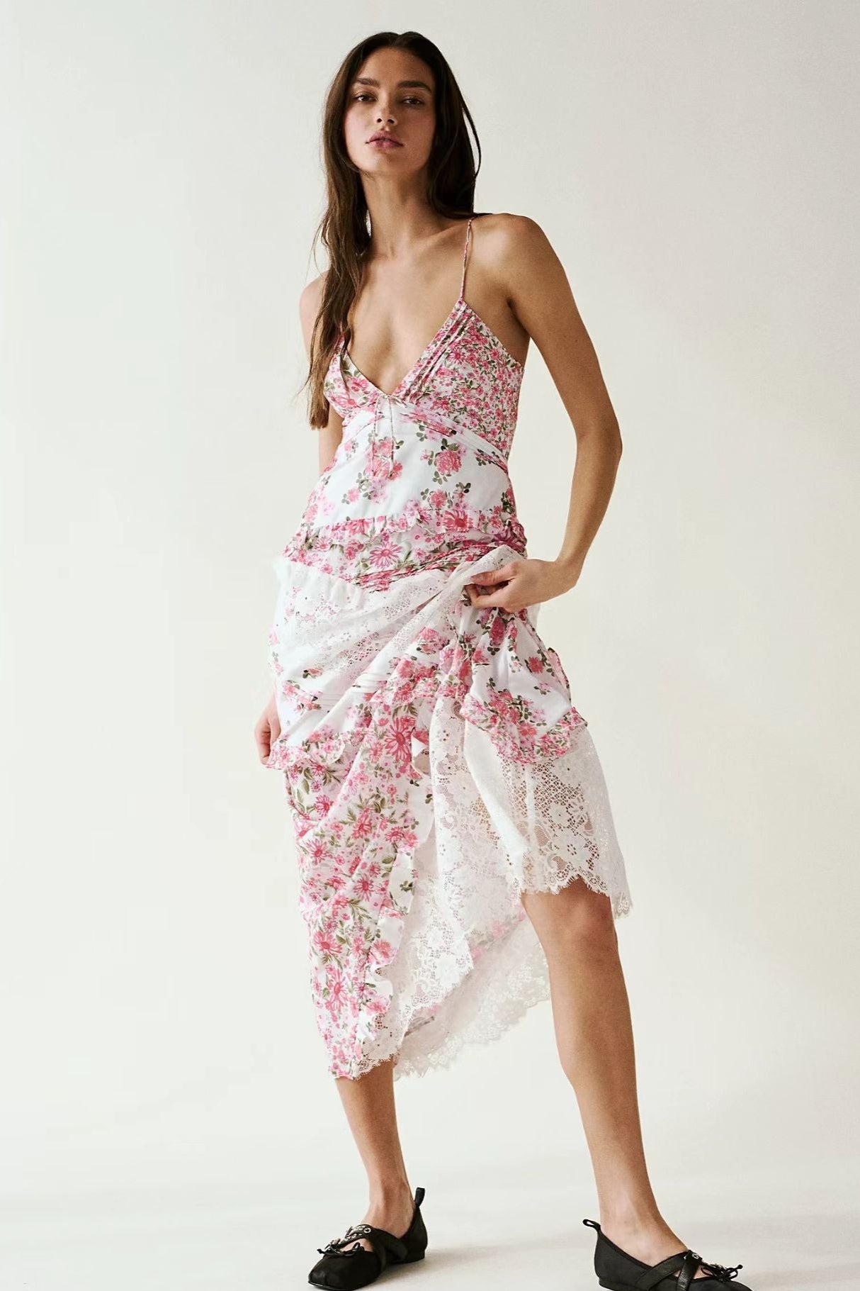 Deep V Ruffle Floral Lace Patchwork Cami Maxi Dress