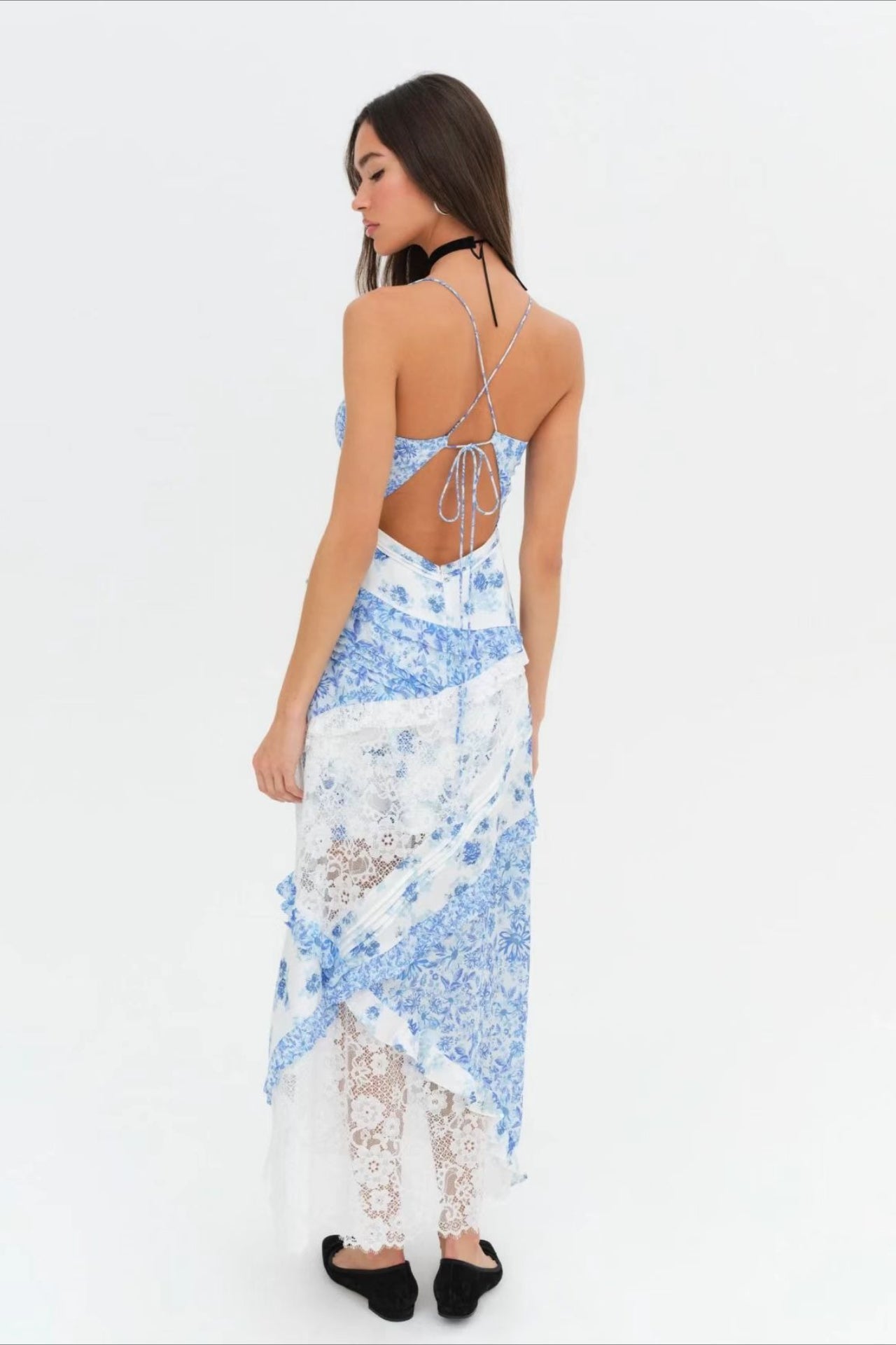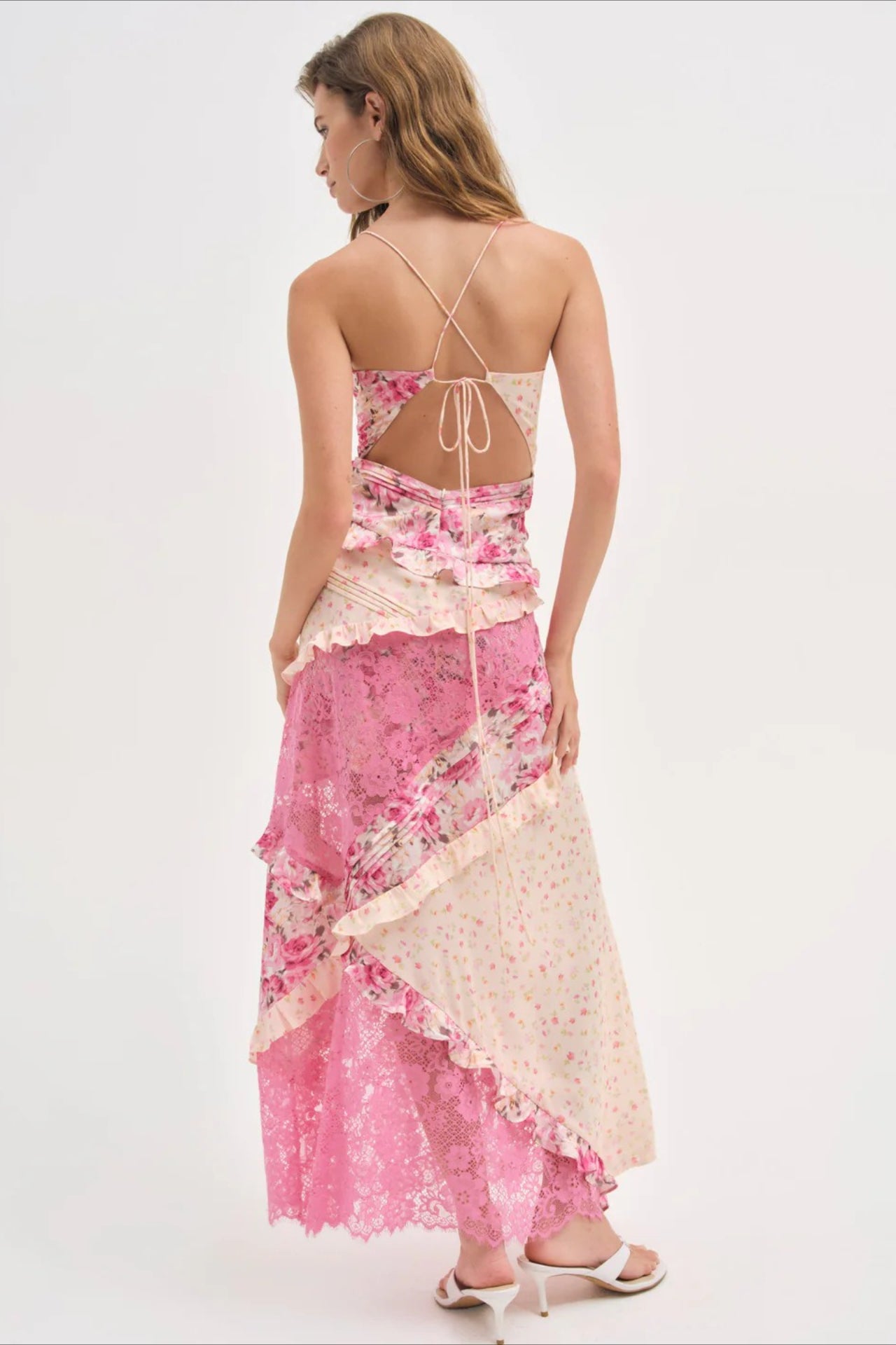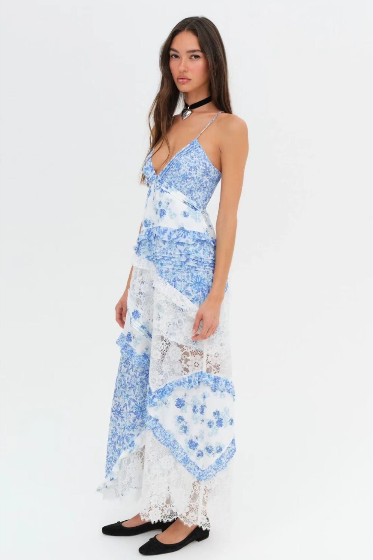 Deep V Ruffle Floral Lace Patchwork Cami Maxi Dress