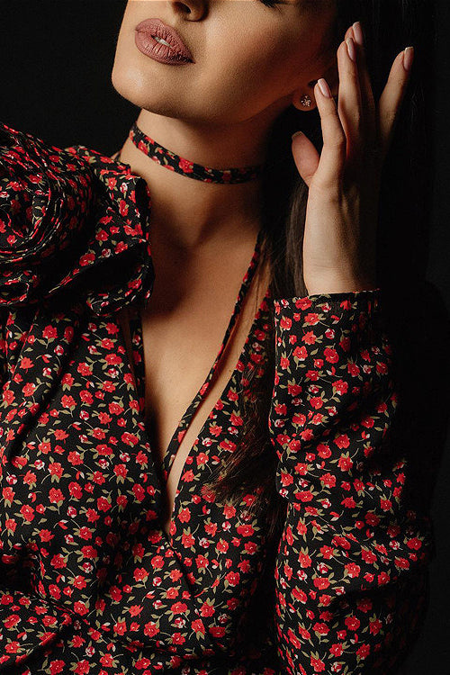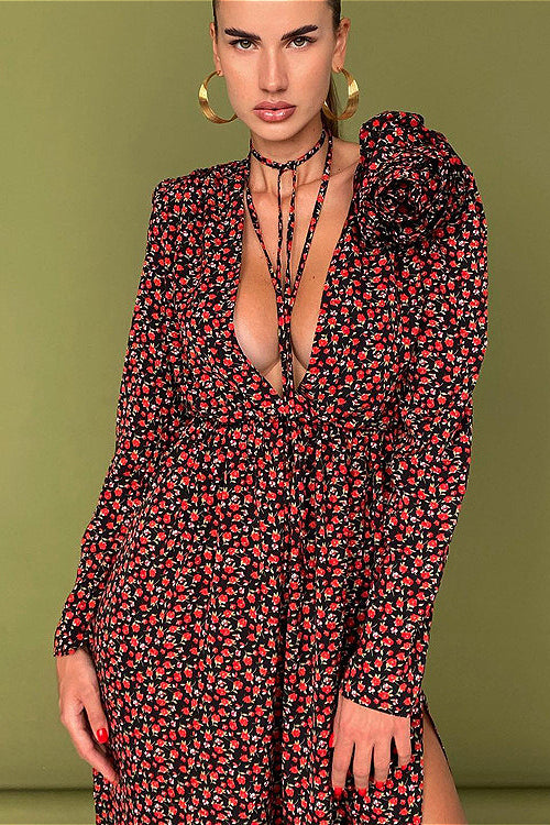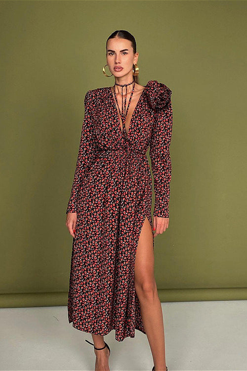 Kleid mit Schnürung in der Taille, tiefem V-Ausschnitt, Seitenschlitz und Blumenmuster