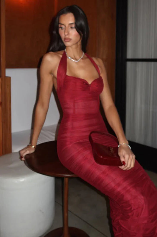 Neckholder-Partykleid mit plissiertem Netzstoff und figurbetontem Schnitt