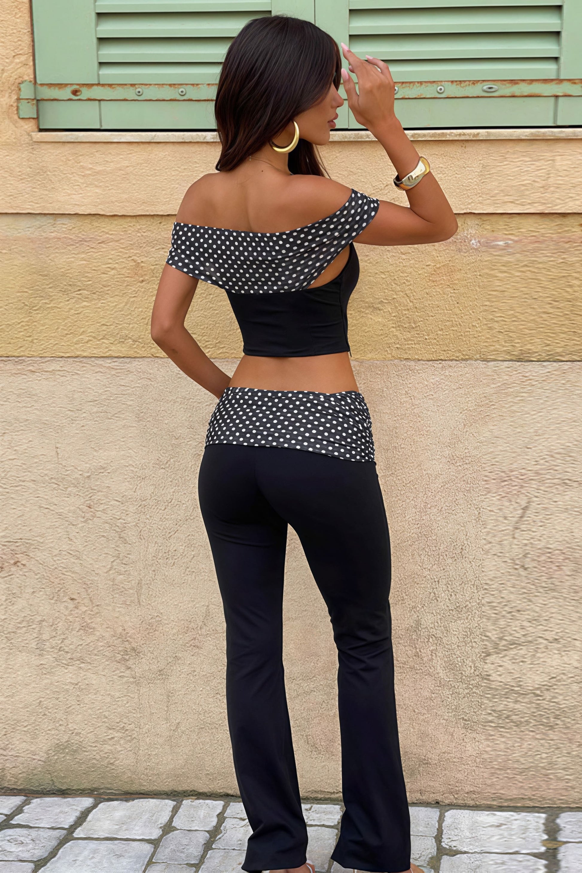 Waist Cuffed Polka Dot Flare Off Shoulder Two Piece Set