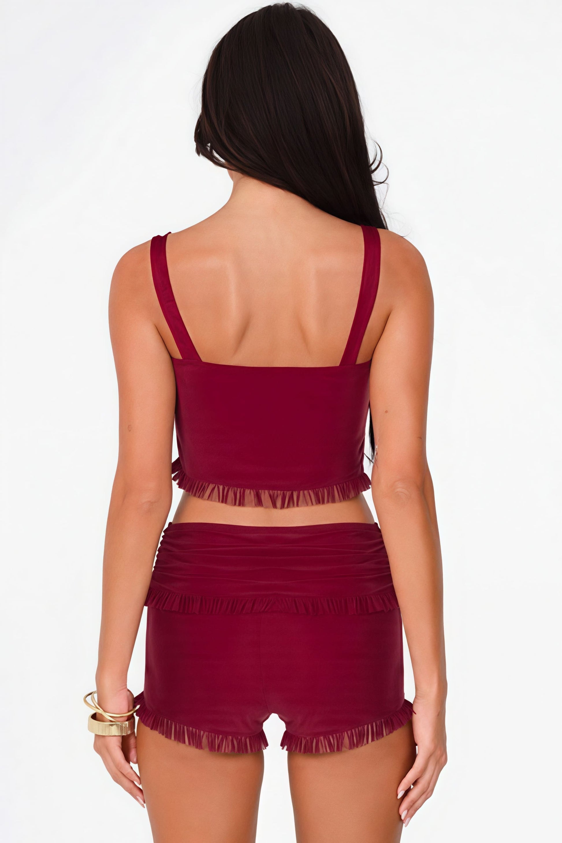 Modisches Camisole-Top mit Druckknöpfen, schmal geschnittene Rüschenshorts und Rock-Set