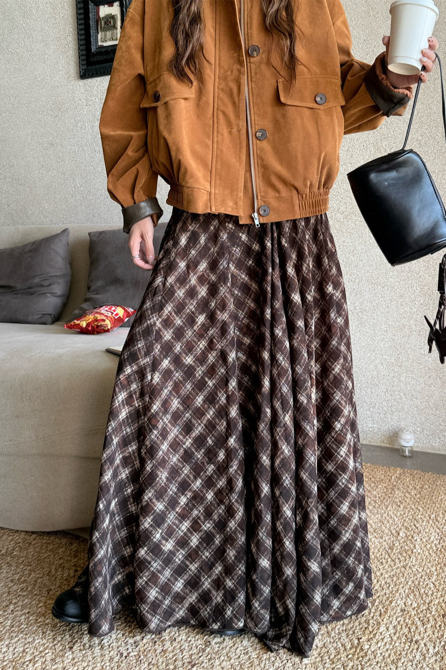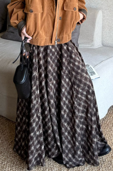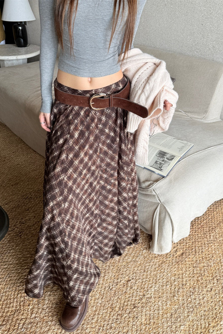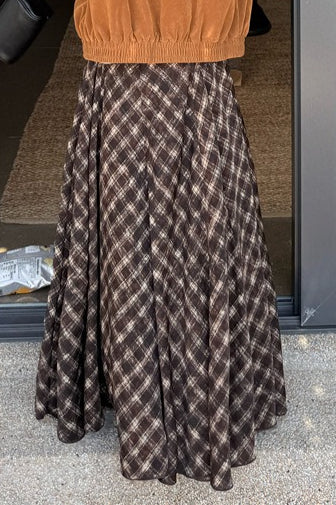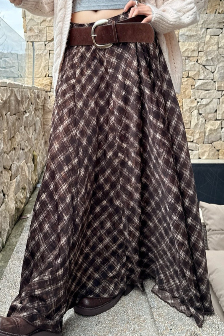 Karierter, Vintage-farbener, erdiger Midirock mit hohem Bund und fließender Silhouette, hoher Taille, fließend, aus der Zeit von