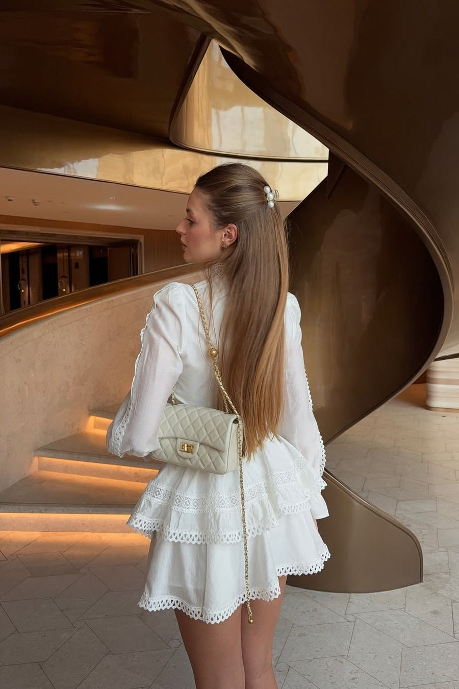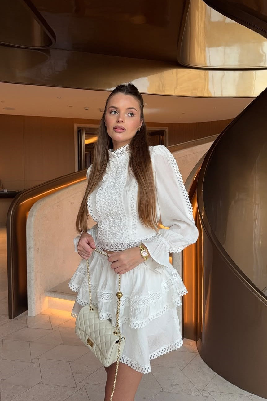 Zweiteiliges Set mit Stehkragen und Rüschenrock aus Spitze im Vintage-Stil
