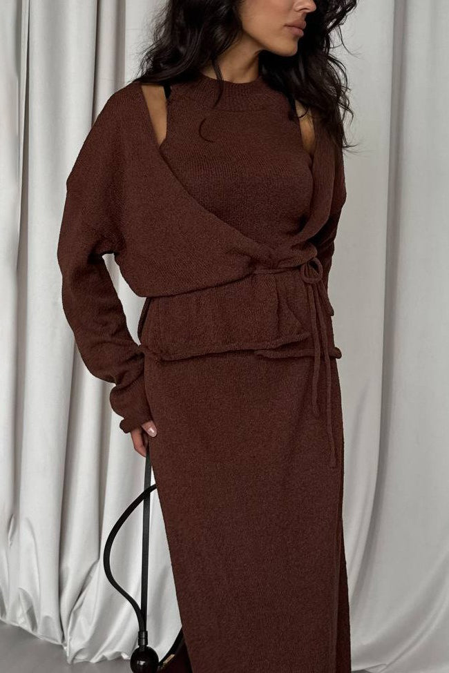 Schickes dreiteiliges Set aus Strickweste und figurbetontem Rock mit Gürtel