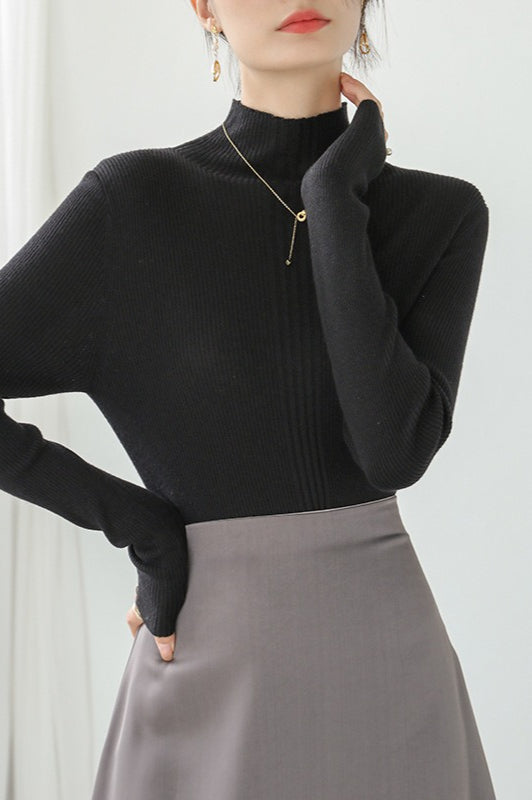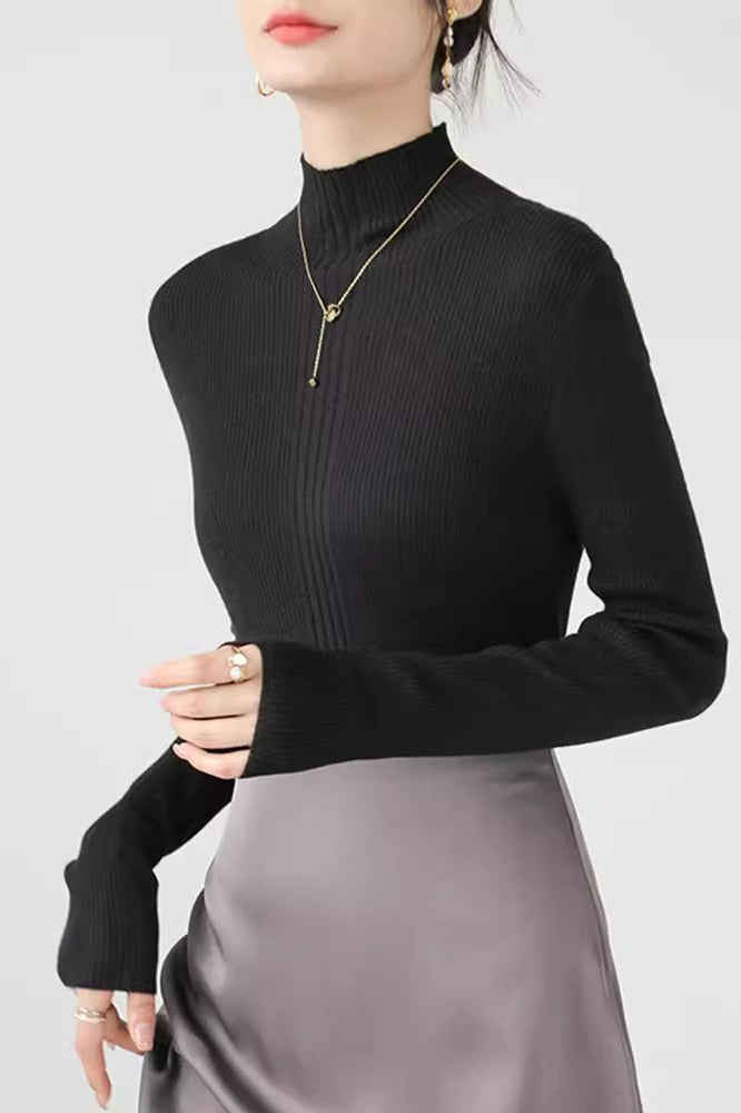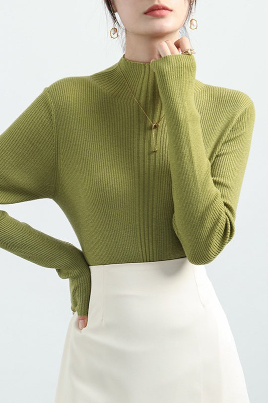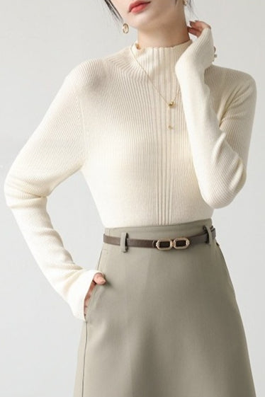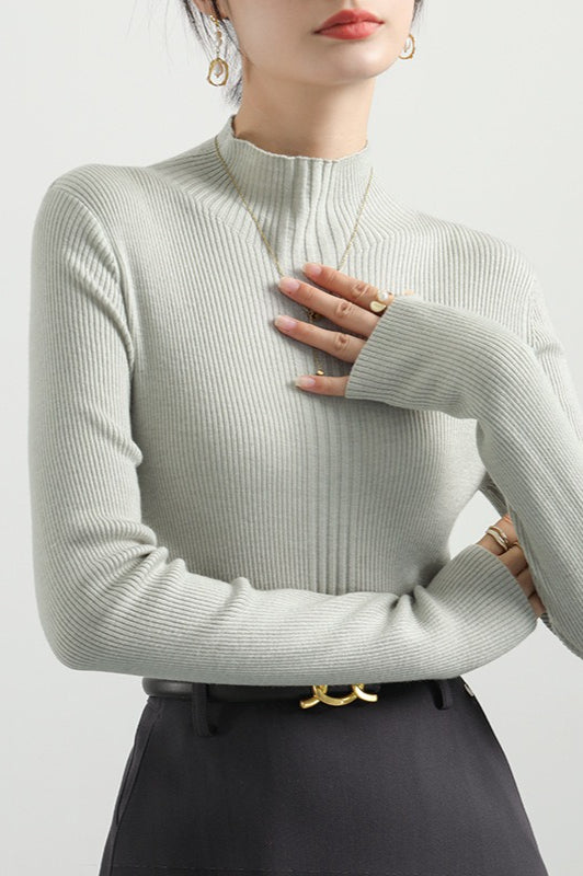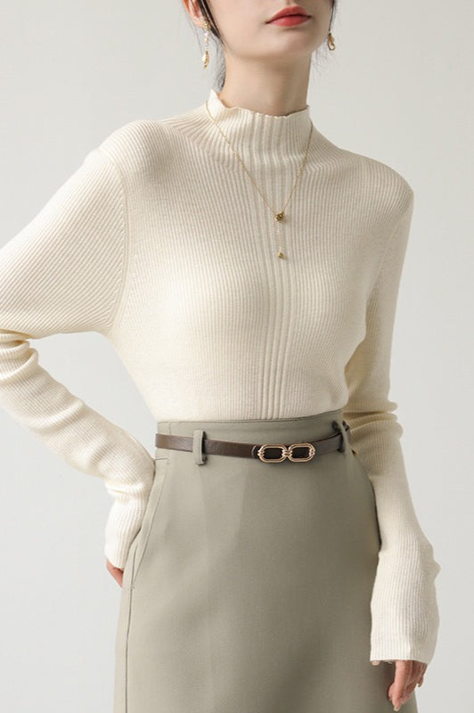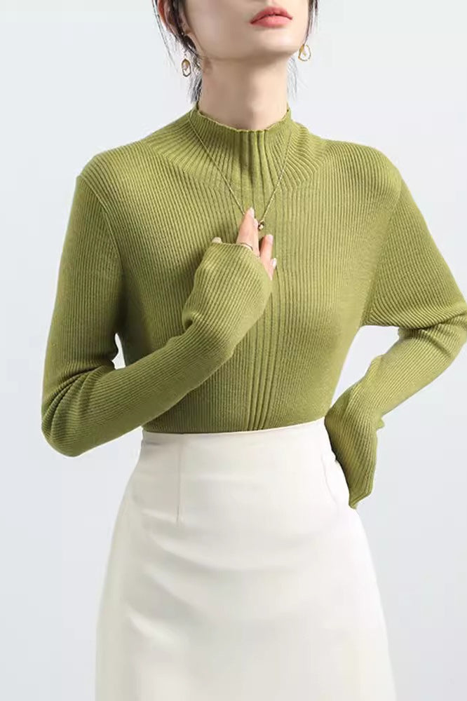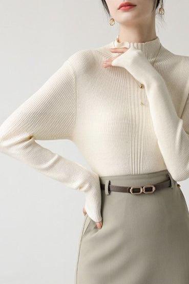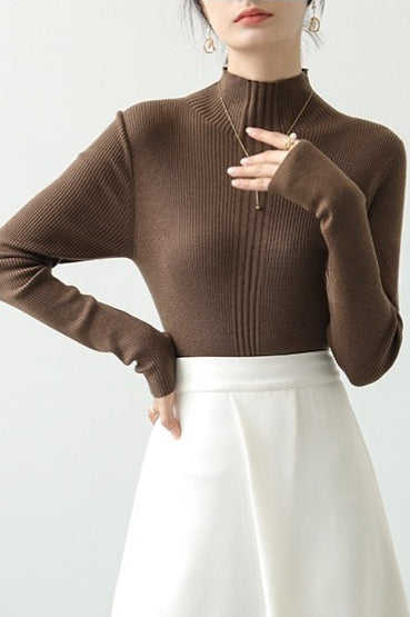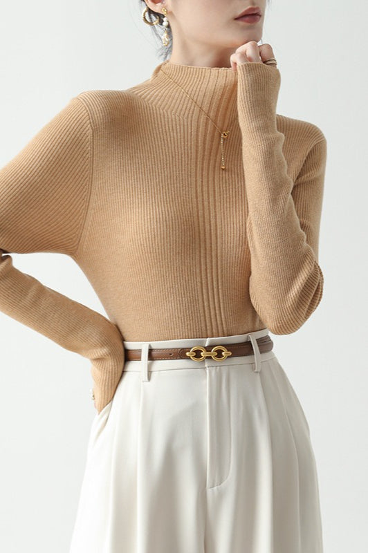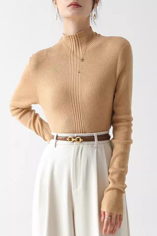 Elegantes aprikosenfarbenes Strickoberteil mit Stehkragen und langen Ärmeln