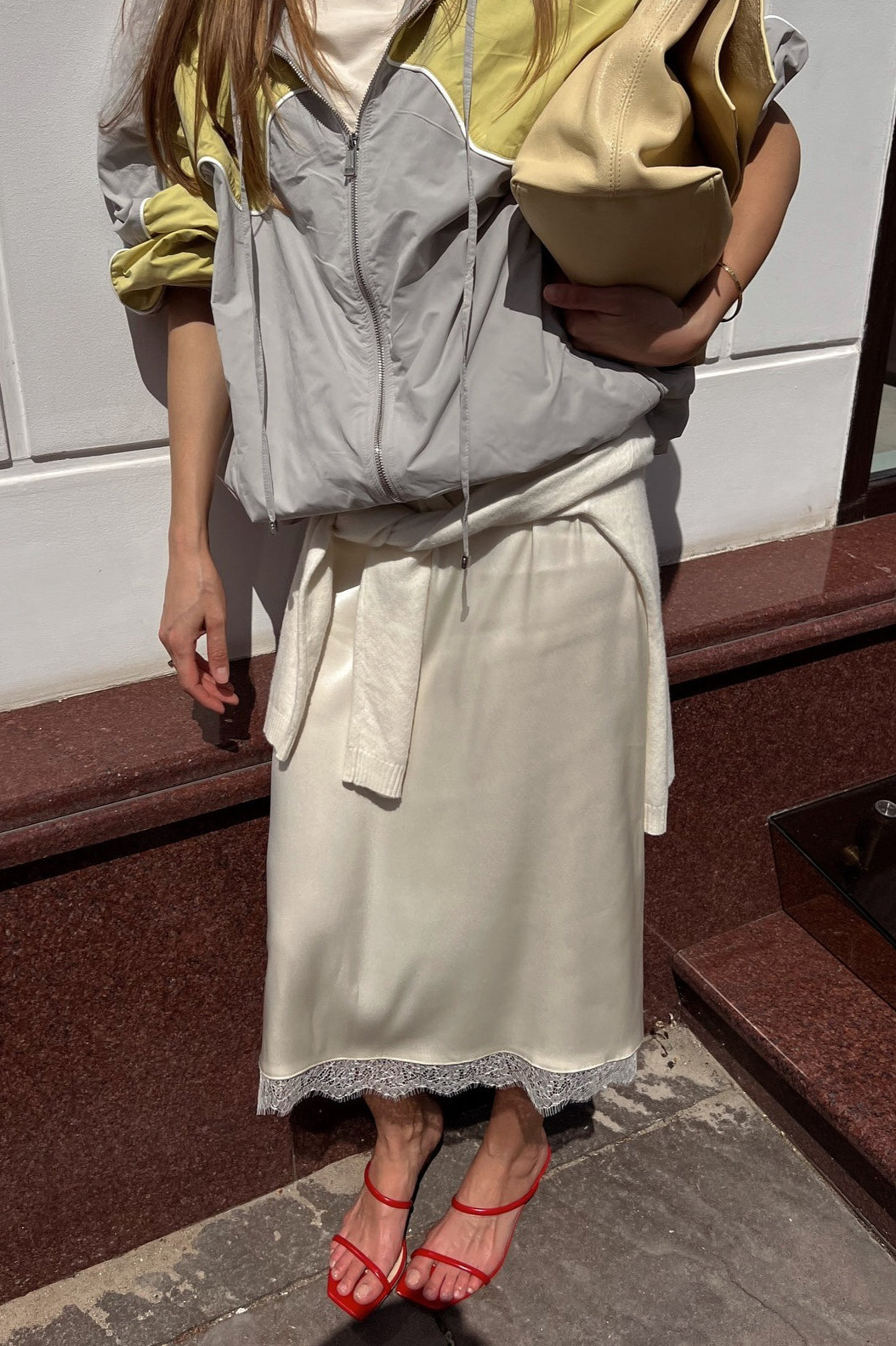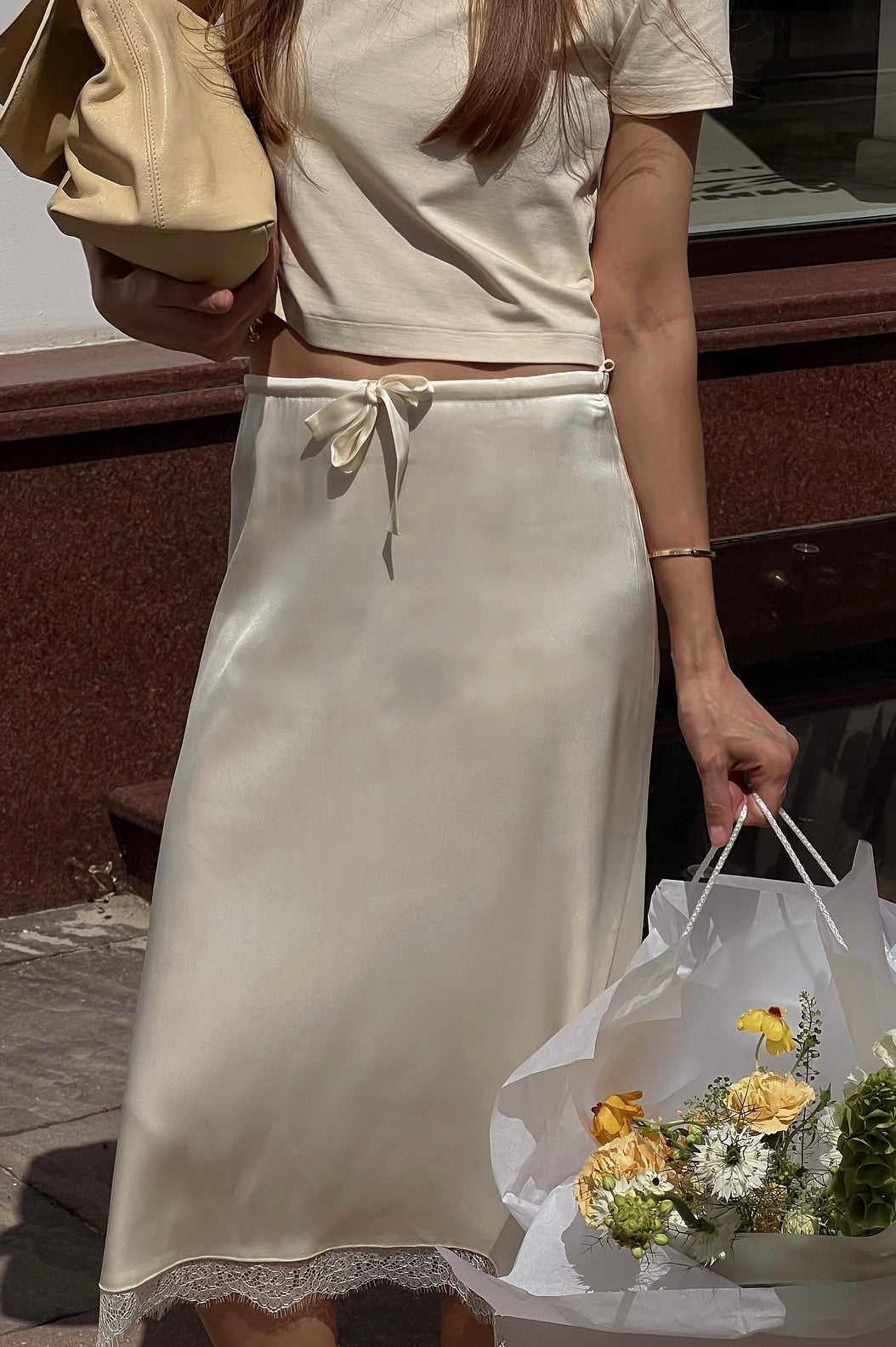 Elegant Lace Trim Tie Waist Midi Skirt