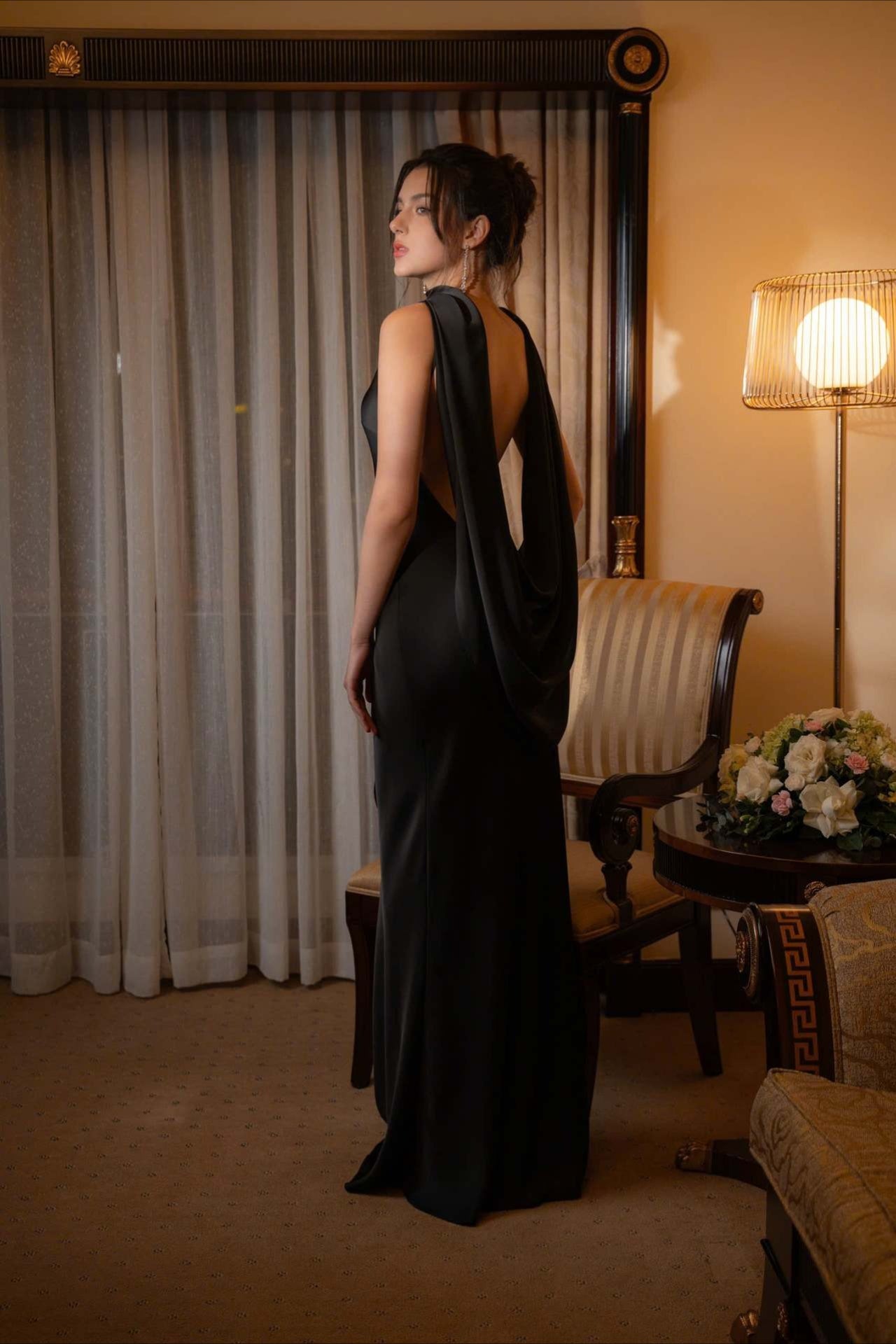 Elegantes, einfarbiges, langes Ballkleid aus Satin mit drapiertem Rücken