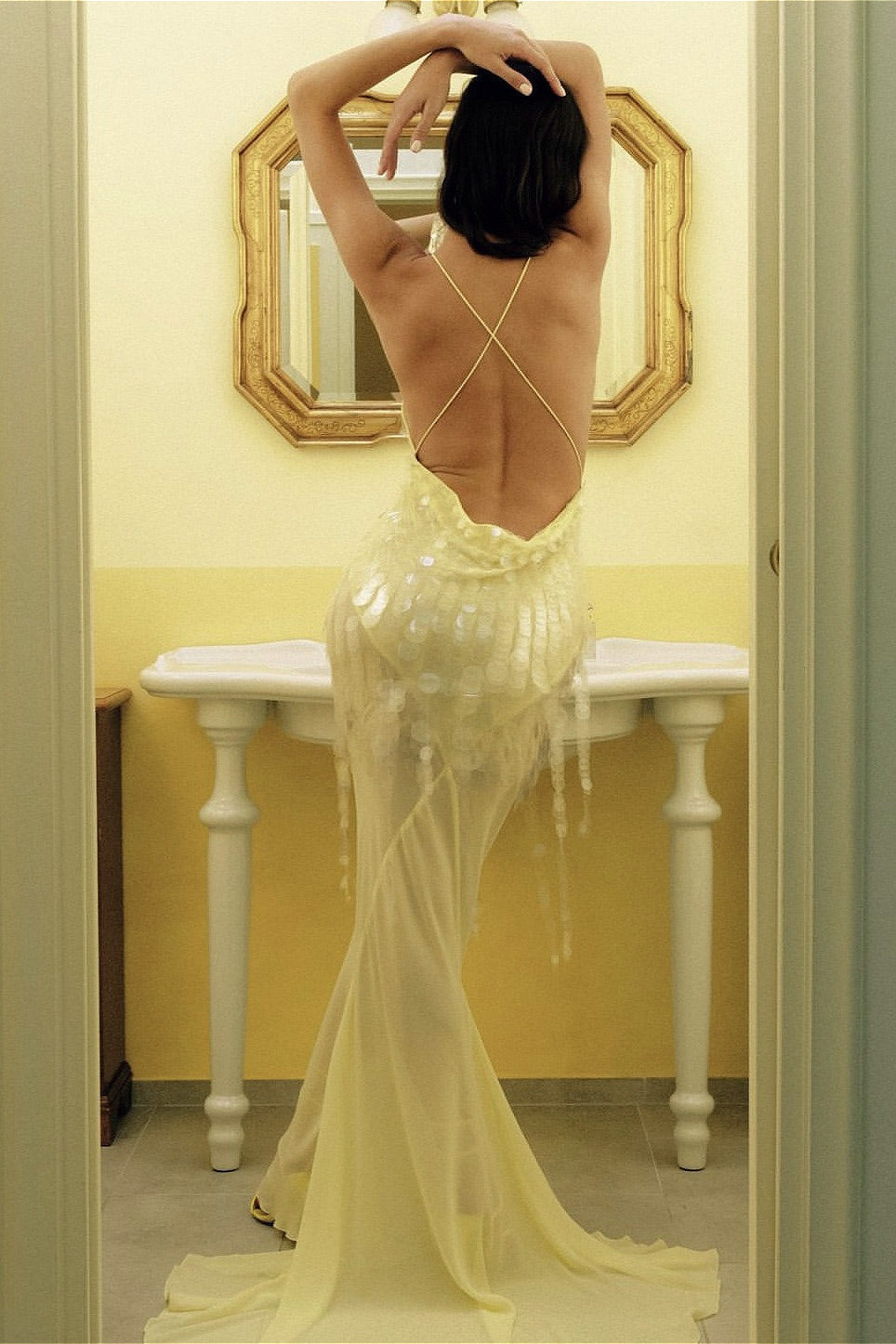 Hohles ärmelloses Kleid mit Pailletten und Blumenmuster und hoher Taille