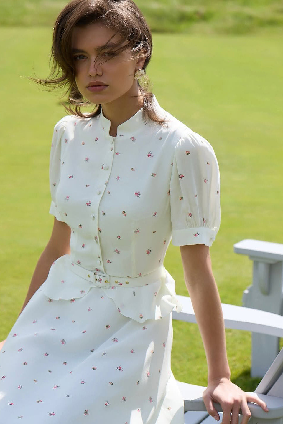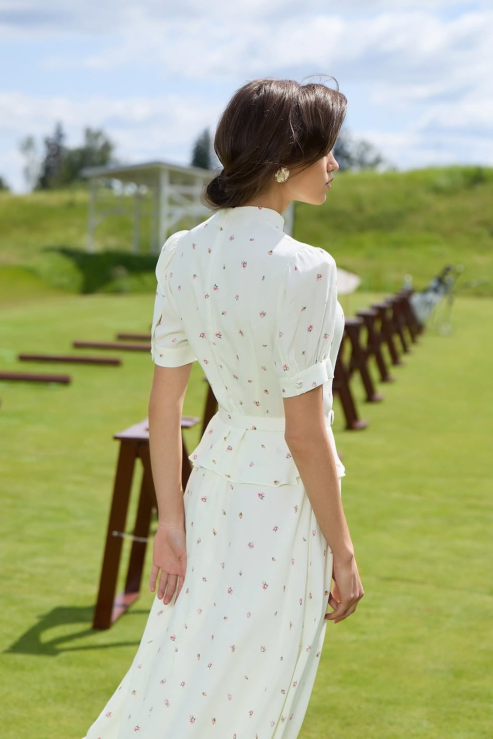 Zweiteiliges Set mit Puffärmeln, Blumenmuster, Stehkragen und Taillengürtel