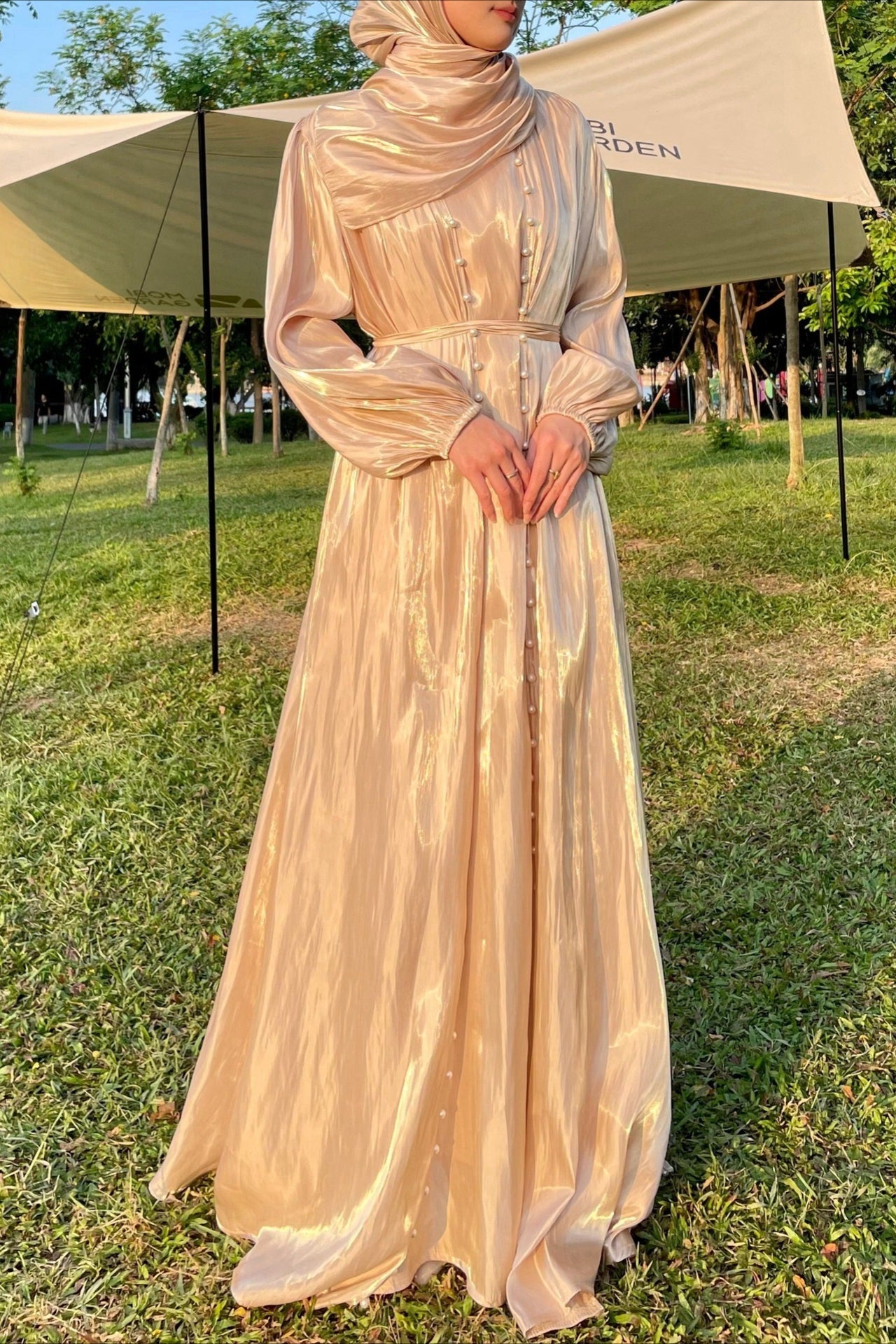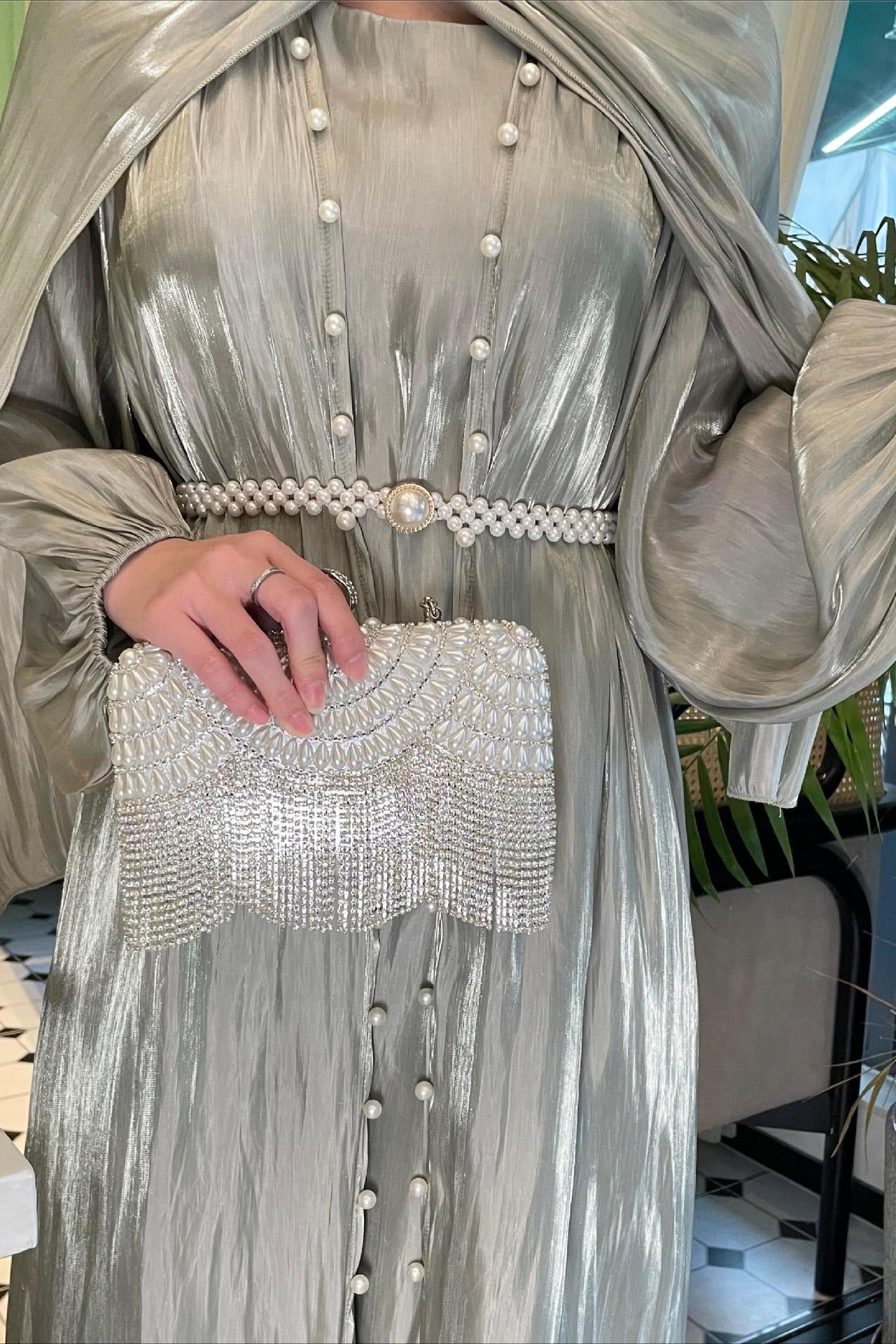 Dreiteiliges Ballkleid aus schimmerndem Tüll: Innenrock, Außenrock, Kopftuch
