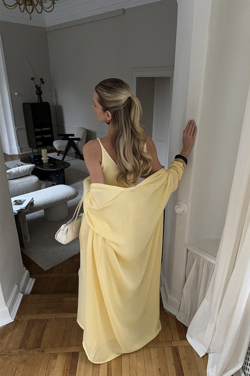 Zweiteiliges Set aus weichem Strickkleid mit Cut-outs, langärmeliger Strickjacke und Tanktop-Kleid