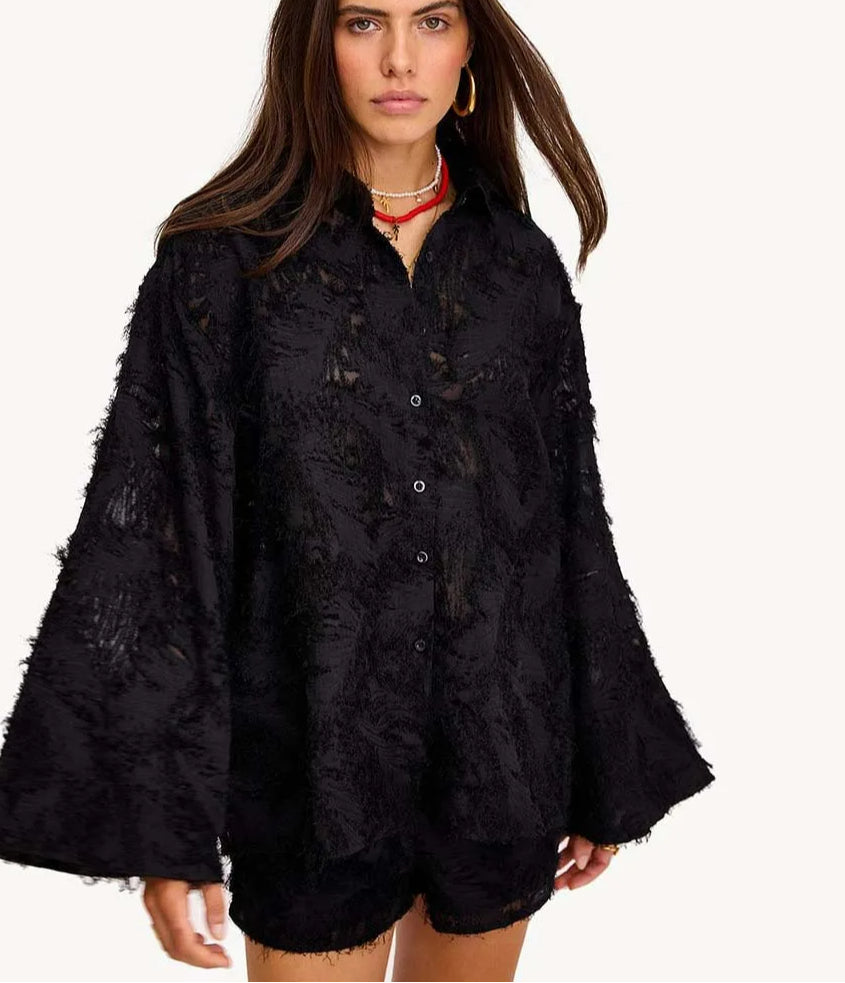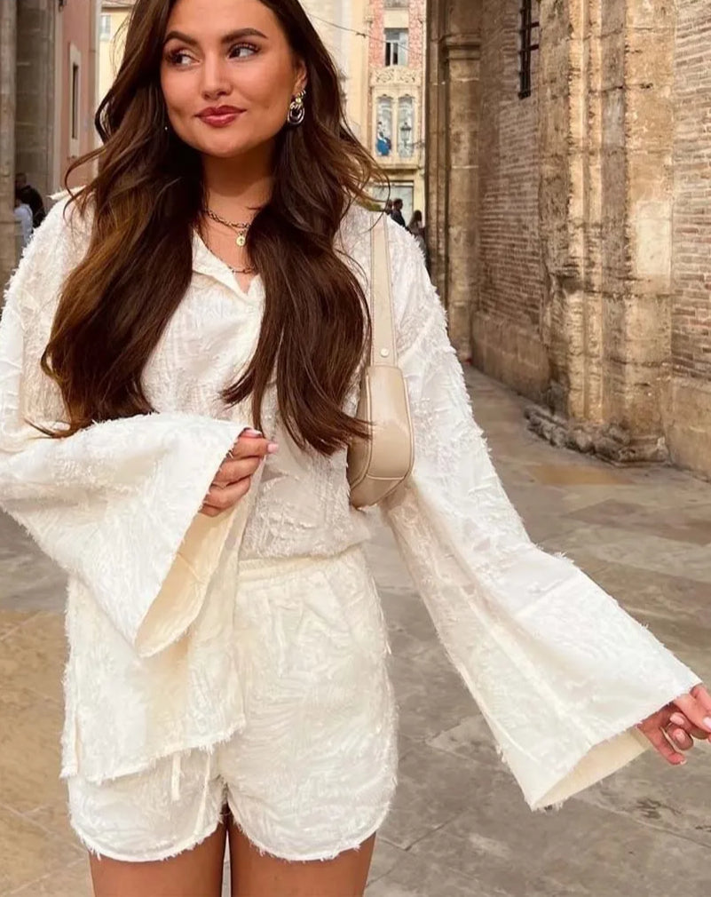 Gelbes, zweiteiliges Büro-Shorts-Set mit Federn und Kordelzug